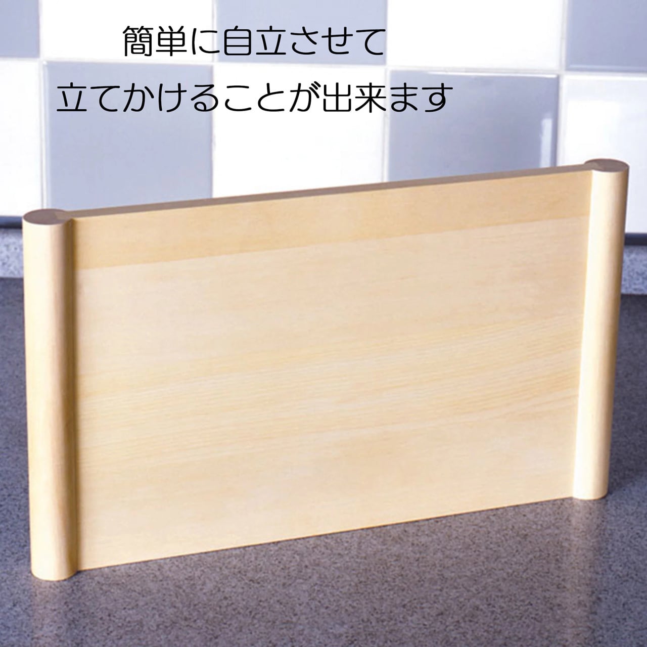 1.まな板の両サイドに付いた丸い脚(桟)を回転させることで、まな板自体を自立させることができます。